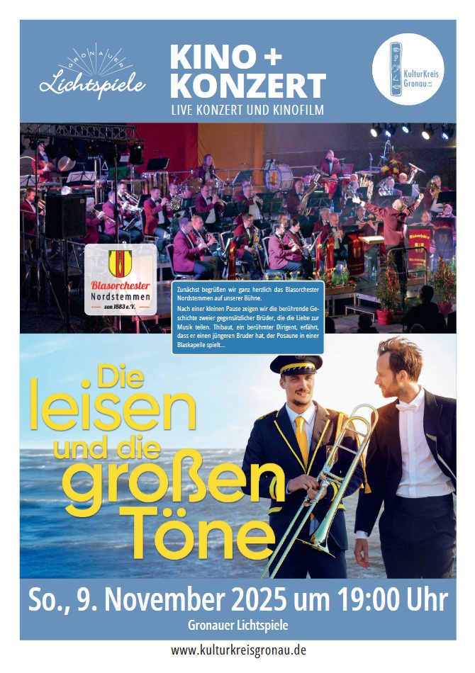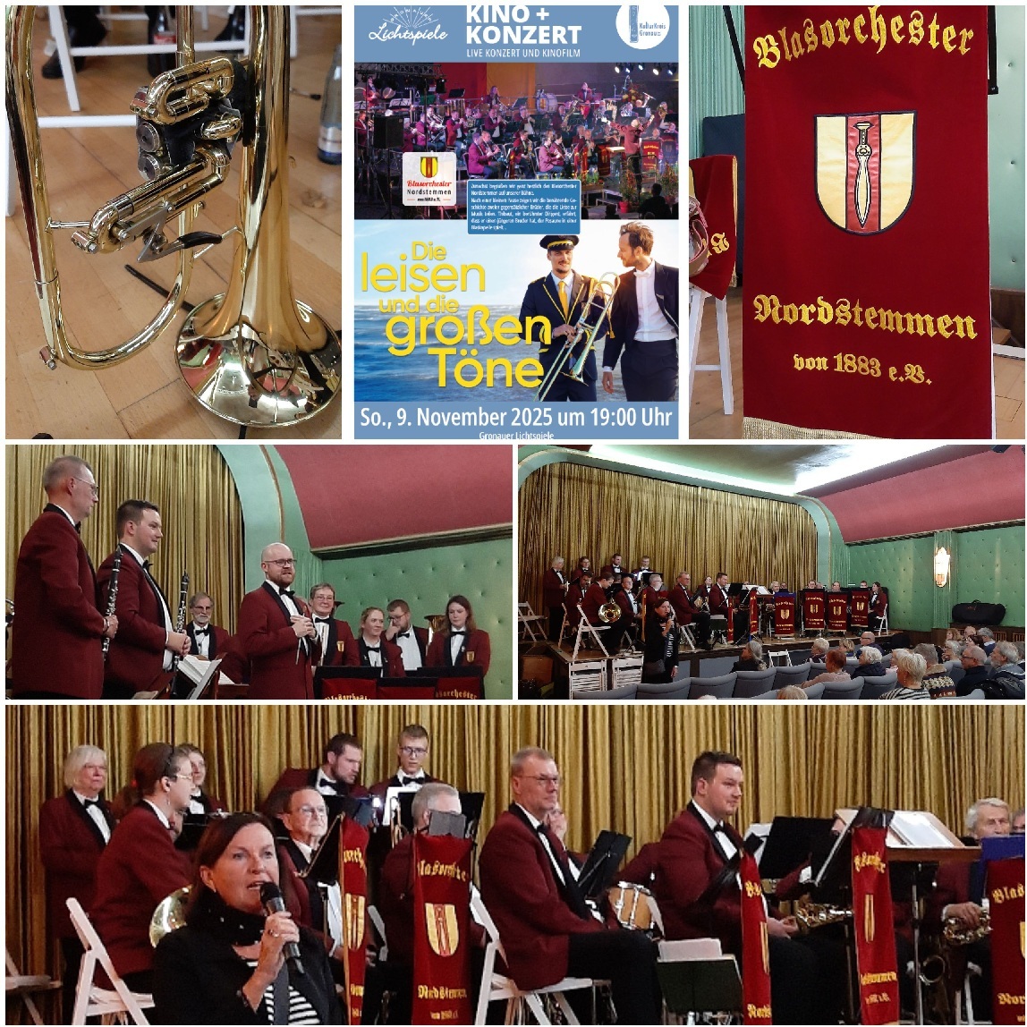 Kino+Konzert „Die leisen und die großen Töne“ mit dem Blasorchester Nordstemmen Es wurde eng auf der kleinen Bühne im Kino, vor der Leinwand wurden Stühle aufgebaut, Instru